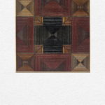 Concentric squares in earthy tones of black, red, and ochre form a grid of shifting depths.