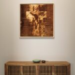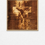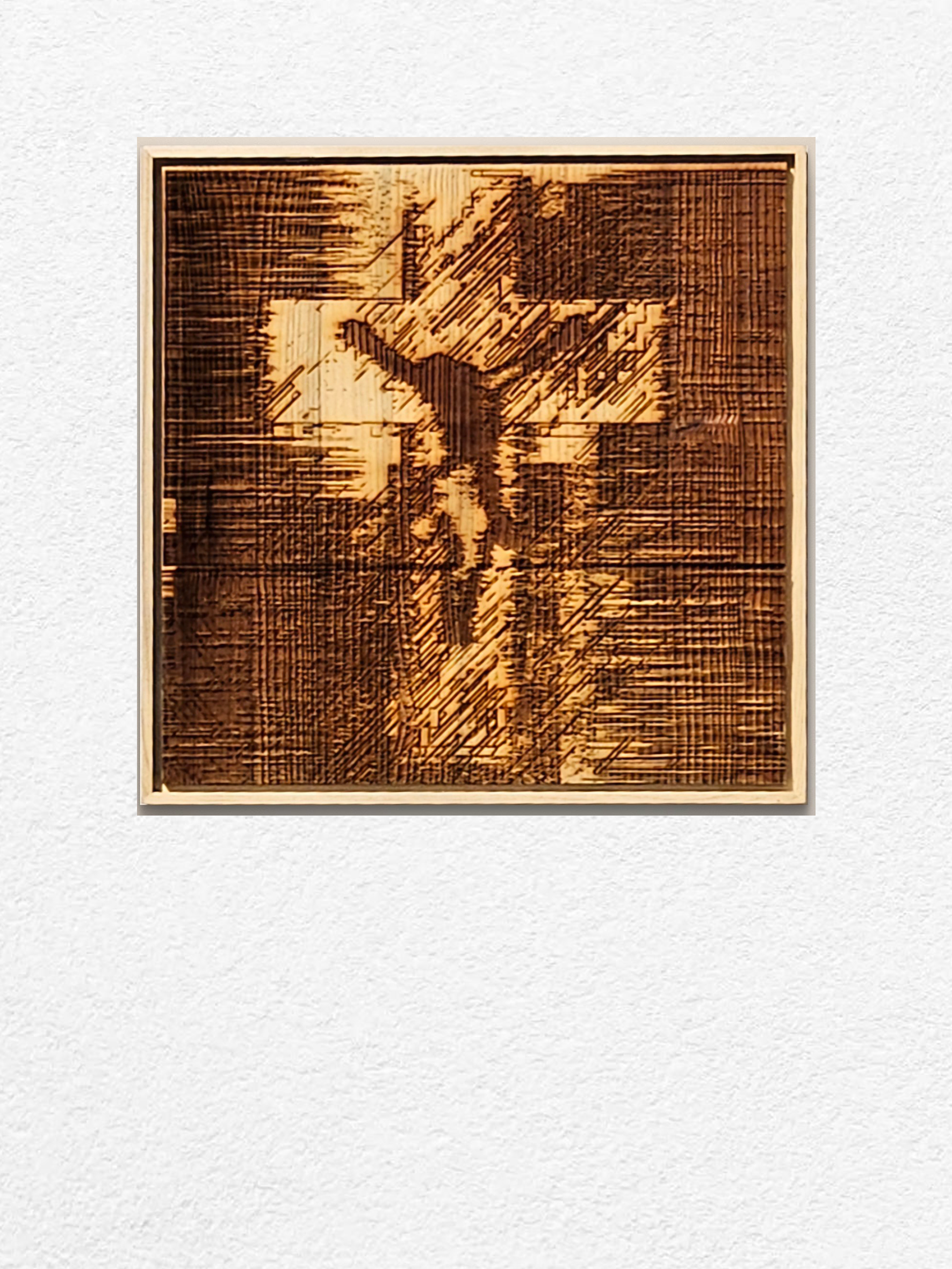 A cruciform figure held within fields of dense texture emerges on wood. Its outline feels both fragile and enduring, a threshold where shadow becomes presence.