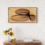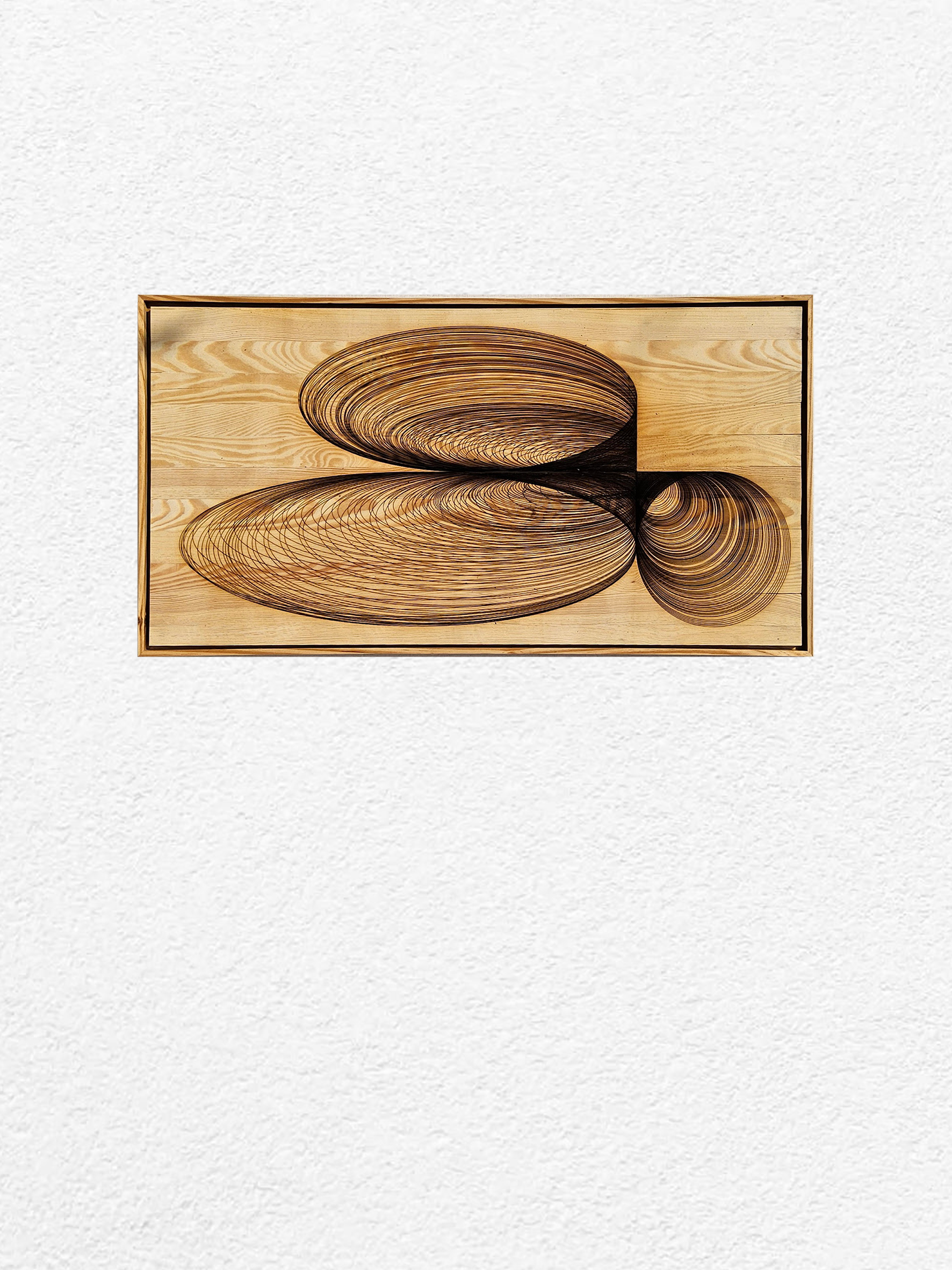 Rounded, pod-like forms are suspended within vertical lines, like seeds and fruits in waiting. They embody the quiet potential of growth held within natural containers.