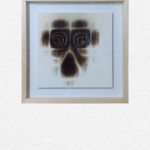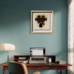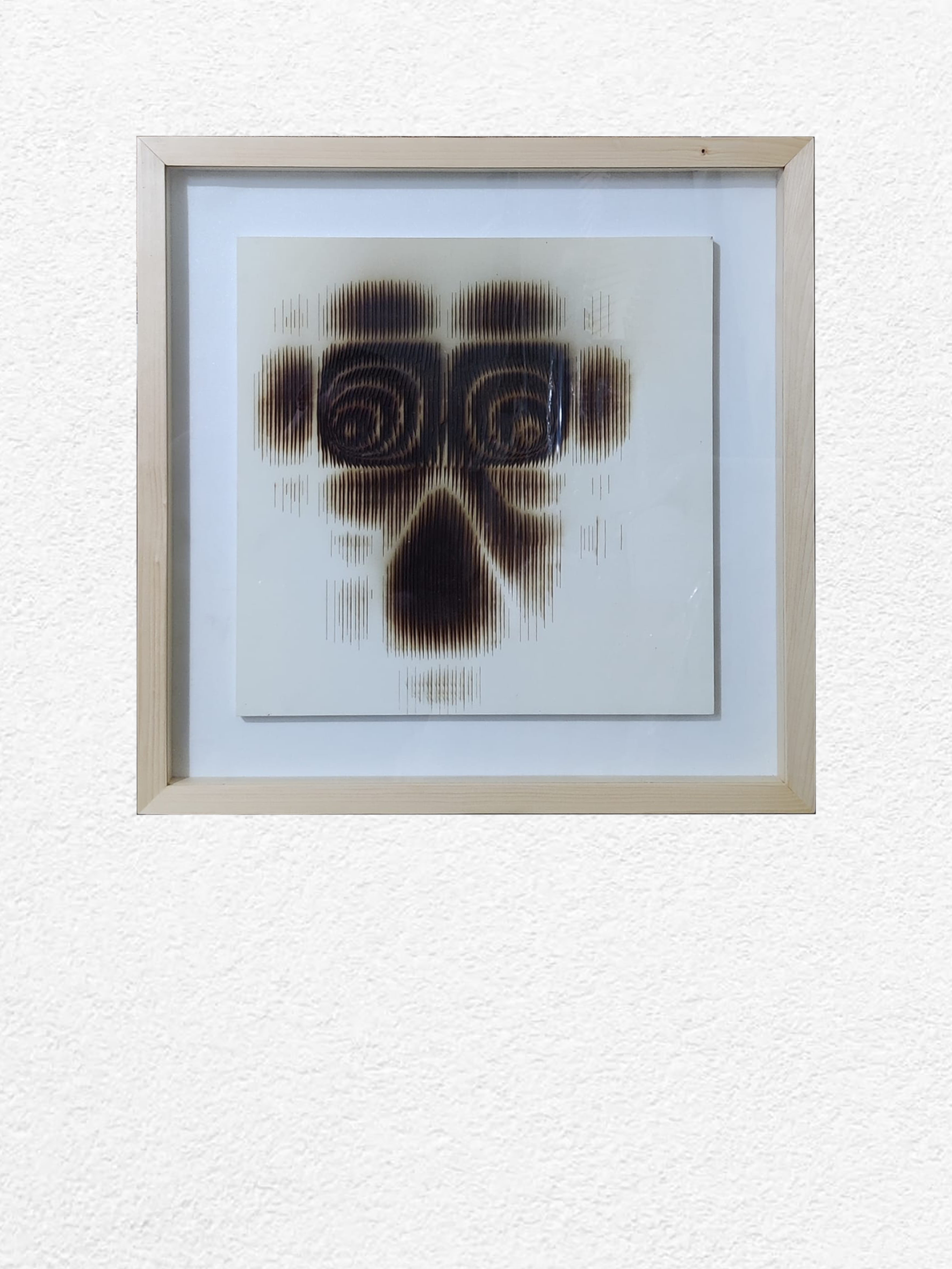 A cruciform figure held within fields of dense texture emerges on wood. Its outline feels both fragile and enduring, a threshold where shadow becomes presence.